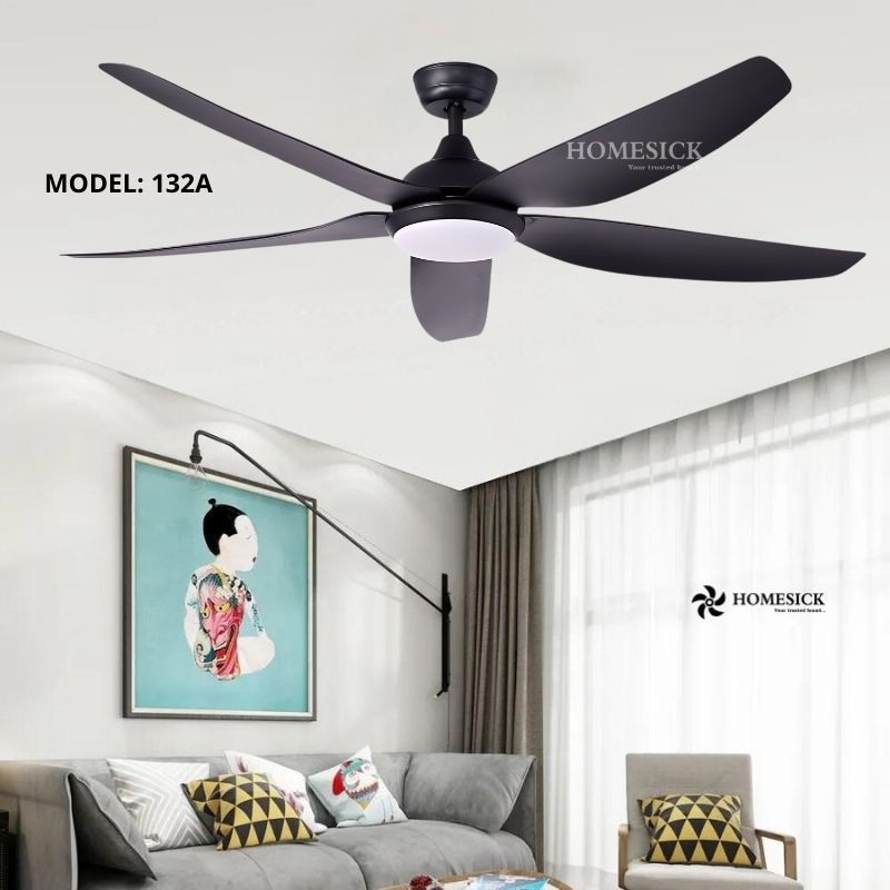 Với thiết kế 5 cánh quạt bằng phẳng, màu đen sang trọng và đèn LED trung tâm, quạt trần Homesick 132A là sự lựa chọn hoàn hảo cho những ai yêu thích phong cách hiện đại.